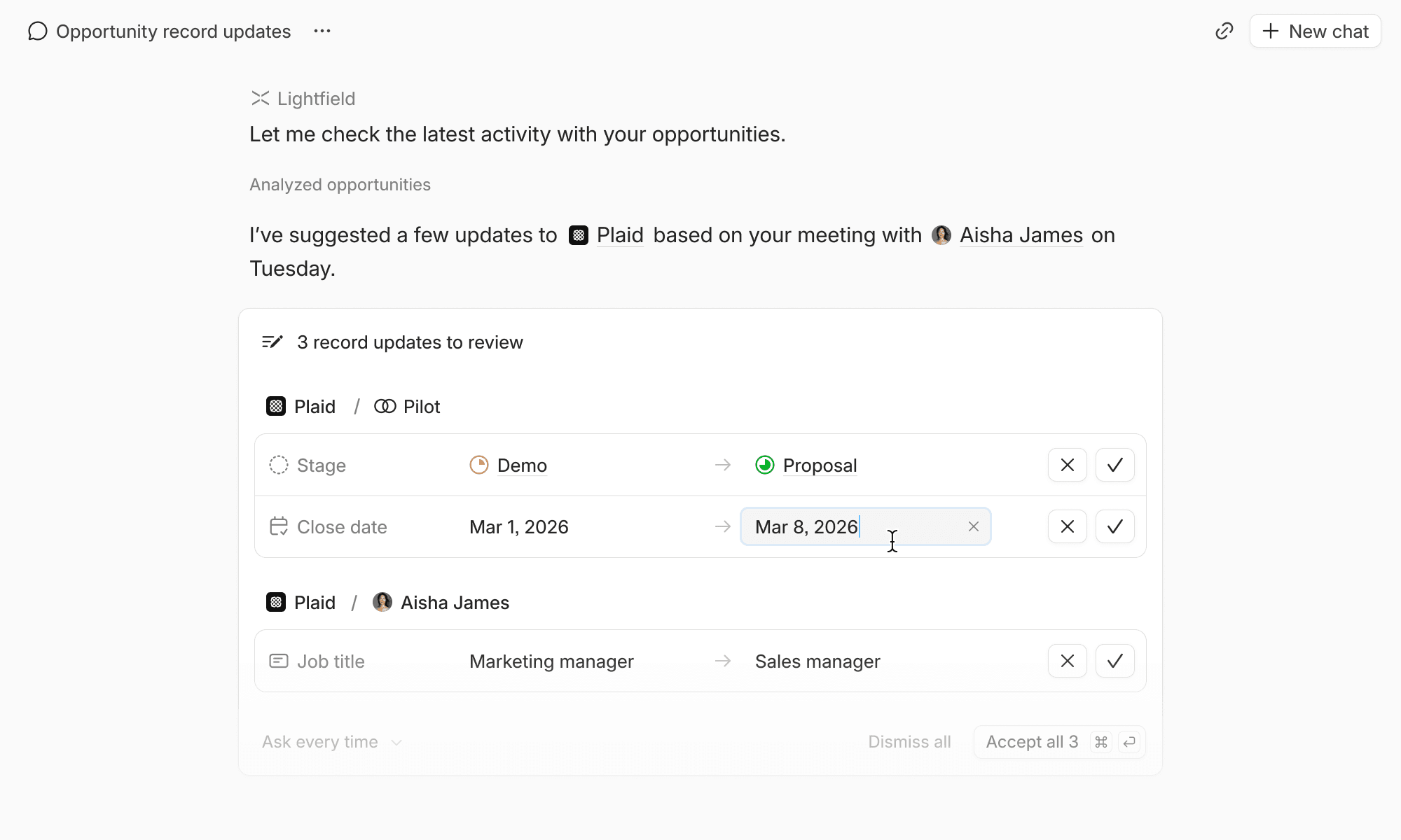 Redesigned how Lightfield handles bulk object creation and edits with the agent. You can now respond to Lightfield’s proposed changes with natural language, or opt to bypass approval entirely, which you can configure in settings.