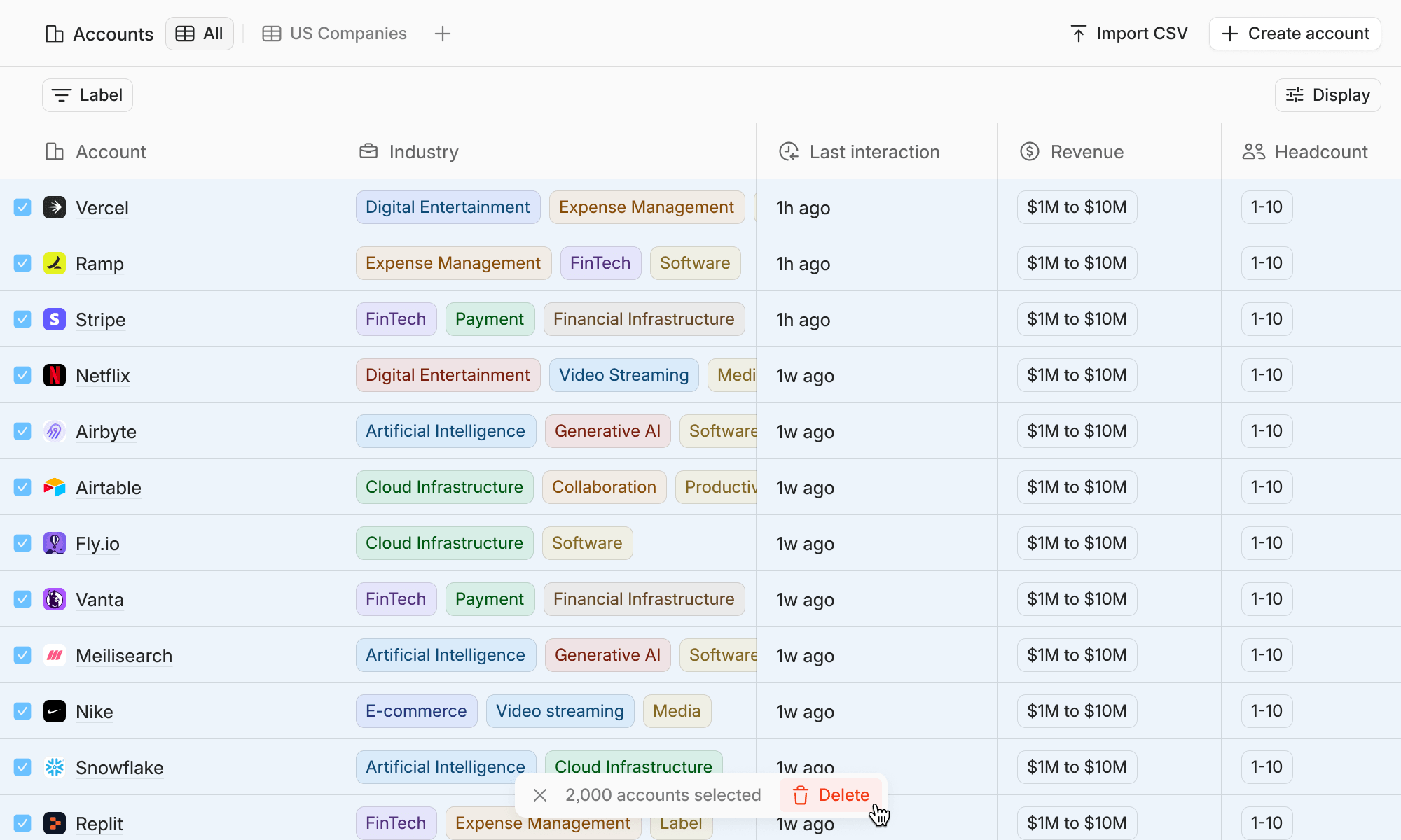 Tables now support bulk selection and deletion. This is currently enabled for Accounts, Opportunities, and will be enabled for all objects in the coming days.
