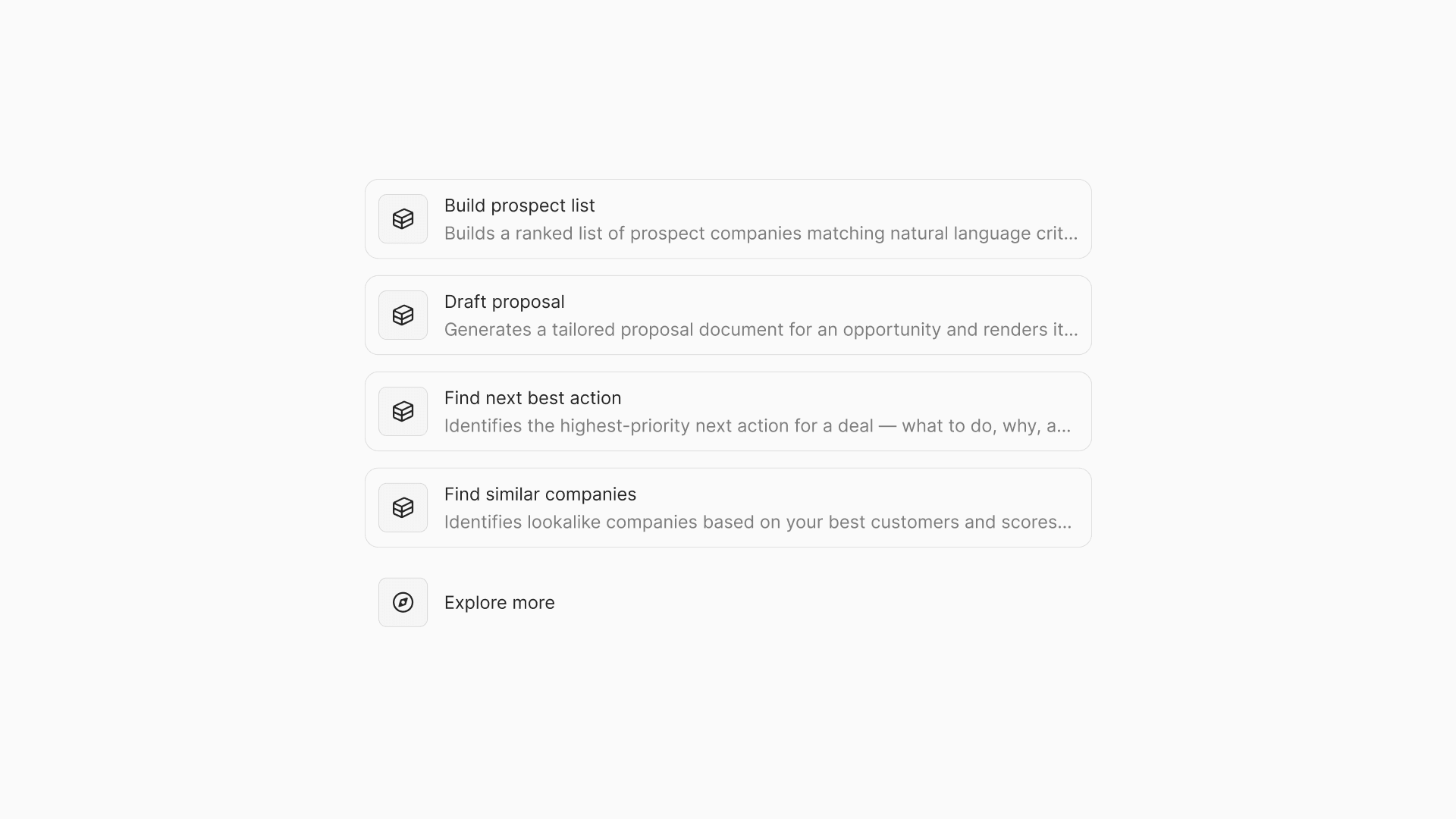 Setup is minutes. Connect your calendar and email to Lightfield, run a Skill from the pre-built library, and you'll have output before your next meeting. No implementation project. No consultants. No custom fields to configure.