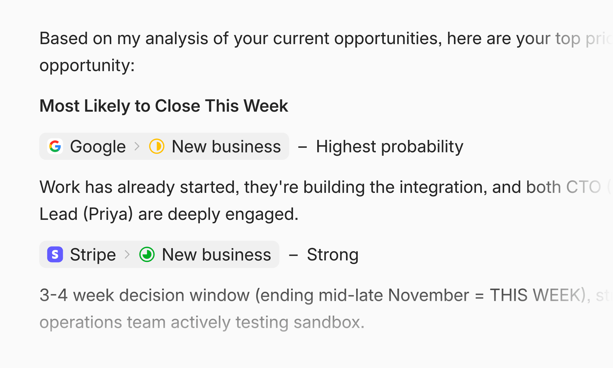 Now, you can upload a broader set of file types when adding context to workspace chat, including RTF and markdown files. Responses in chat and search indicate the related accounts when mentioning opportunities.