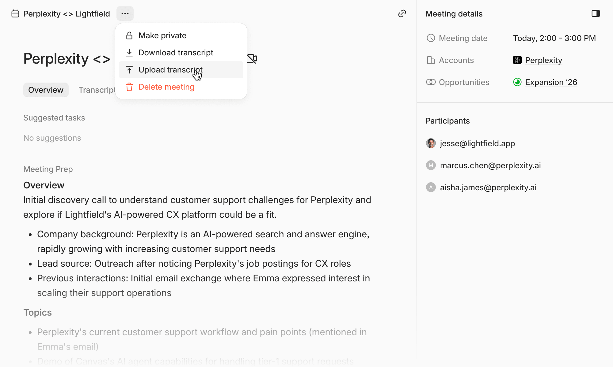 We’ve added the ability to upload meeting transcripts from other services to meetings in Lightfield.