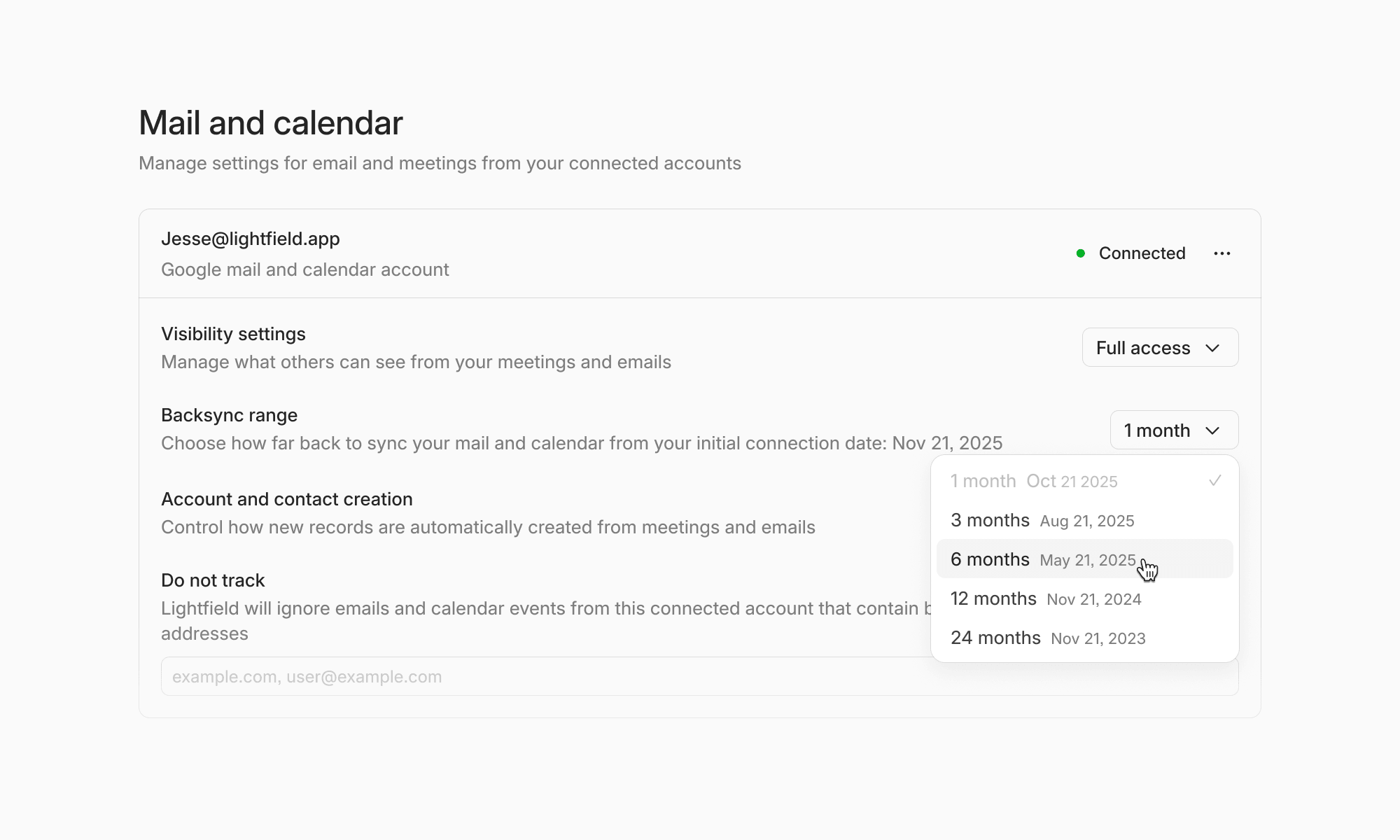 Before, Lightfield created accounts and meetings based on the past 30 days of activity in your inbox. Now, you can configure how long Lightfield will backsync, up to 2 years.