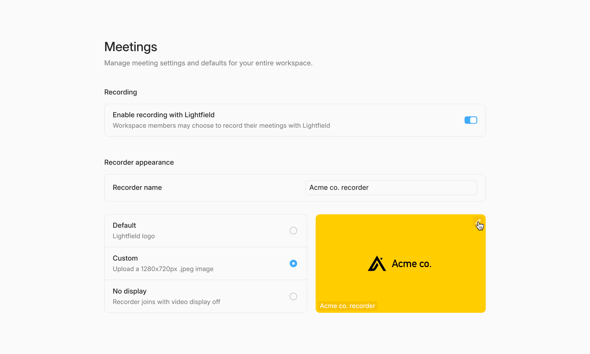 Admins can now also enable or disable meeting recording with the Lightfield recorder for their entire workspace.