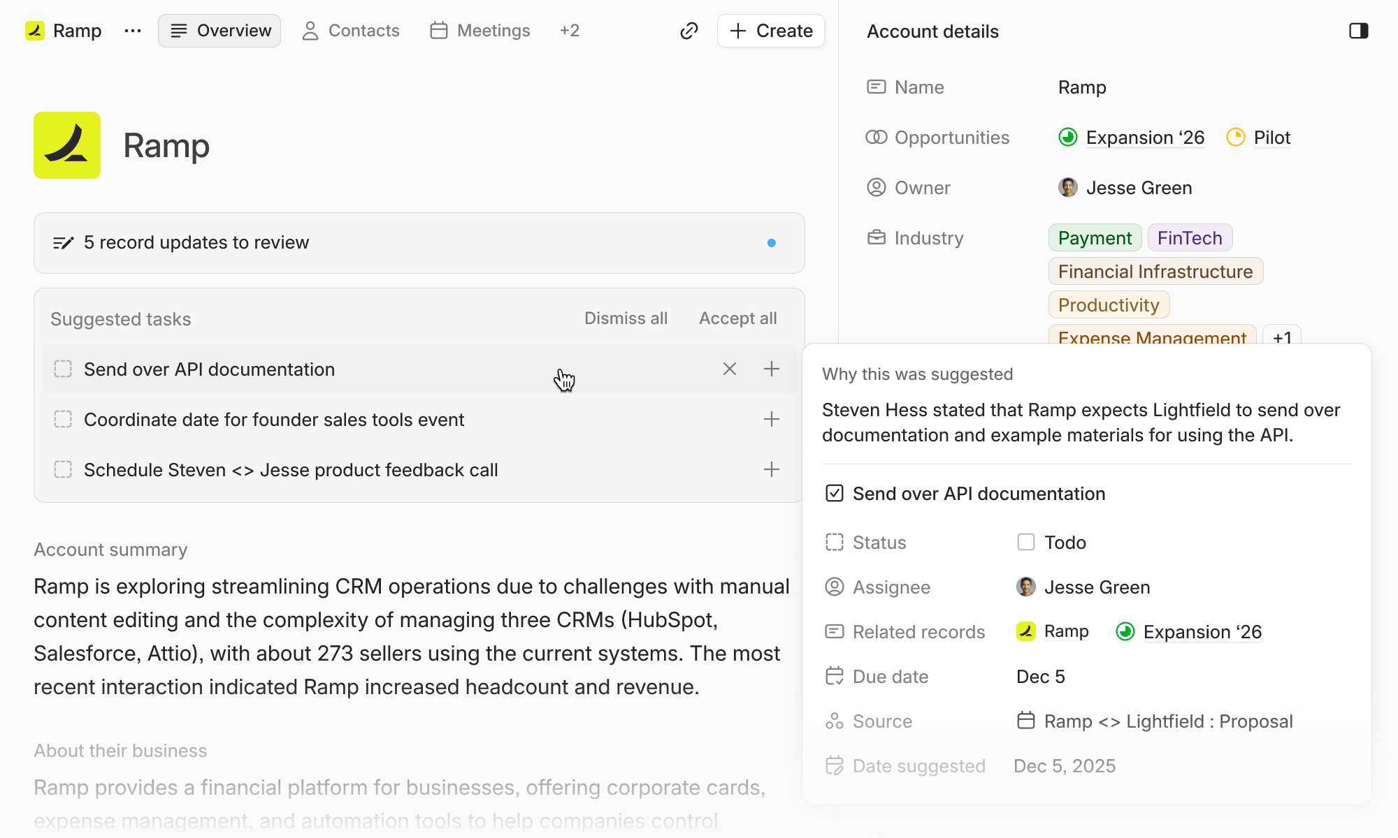 We now surface suggested tasks on related records to make them easier to track. Lightfield will also now capture more tasks from your meetings and emails.
