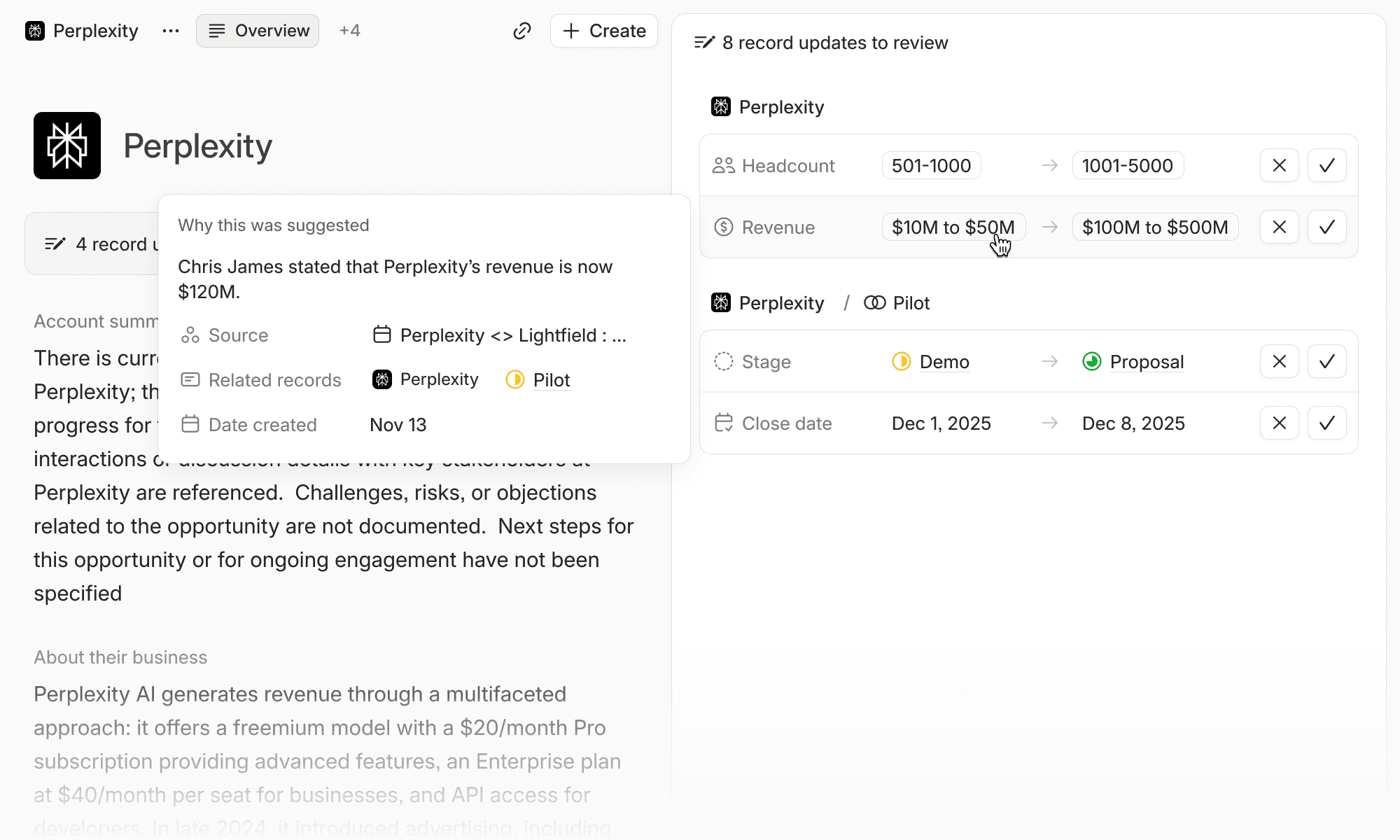 Record updates are now much easier to access. Find them on all related account, opportunity, and contact records. You can see the source of the new value in-line as you accept or reject each suggestion.